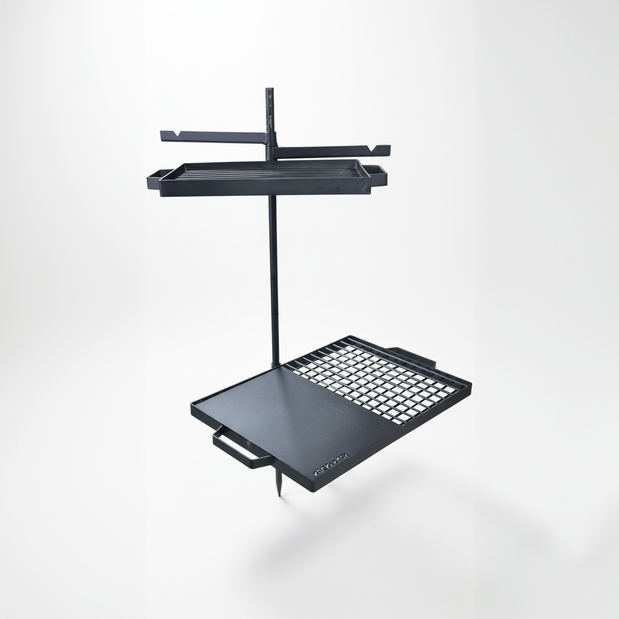 The sturdy steel pole with spike bottom drives firmly into the ground, keeping everything stable over the fire. The adjustable cooking surfaces give you flexibility, with a combination hot plate and grill section so you can sear, fry or grill exactly how you like it.